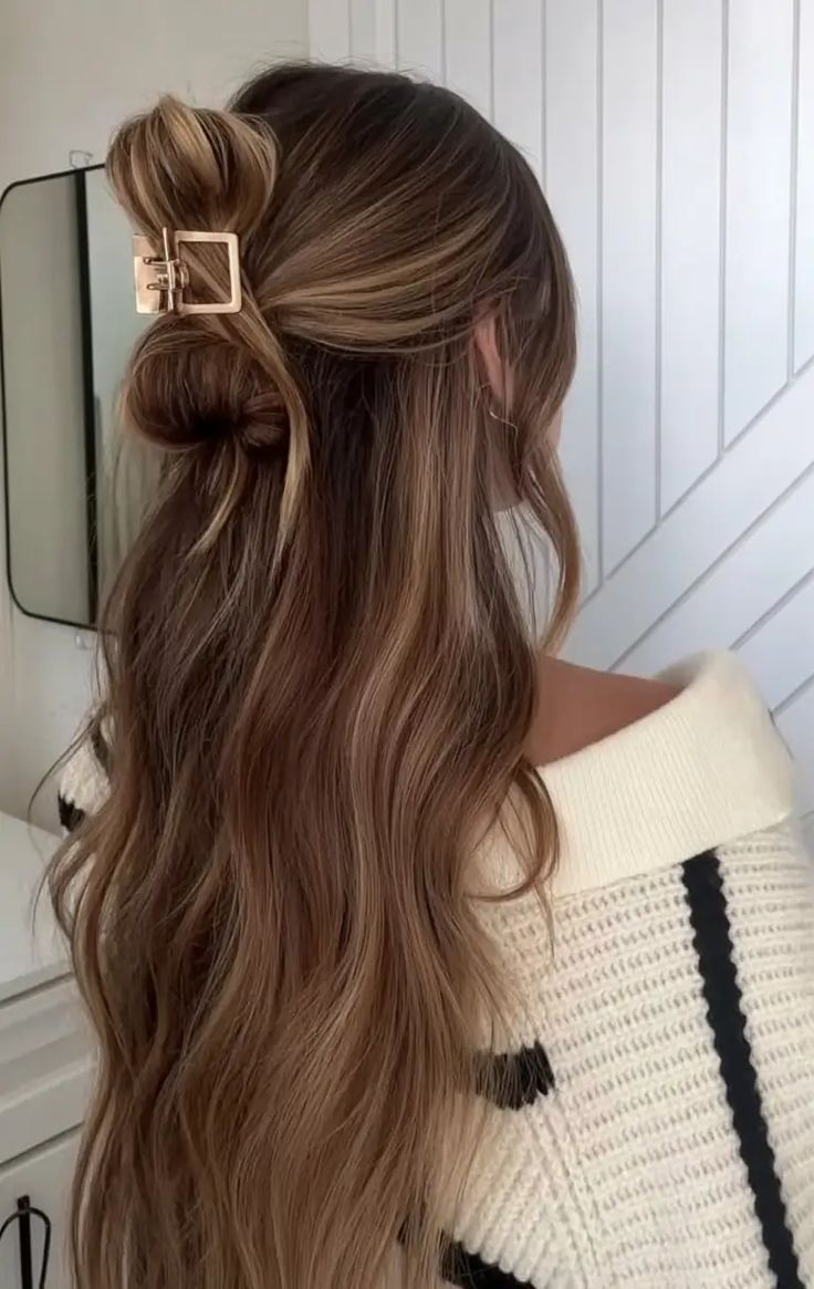 This half-up claw clip twist brings all the nostalgic 90s vibes while still feeling modern and effortless. I love gathering the top section of my hair, twisting it loosely, and securing it with a chunky claw clip. The style works beautifully with long layers because the ends spill out softly, giving a relaxed, breezy look. It’s perfect for days when I want something quick but still cute. The best part is how it instantly lifts the face and adds volume to the crown. Whether I’m staying home or going out, this hairstyle always feels stylish and low-maintenance.