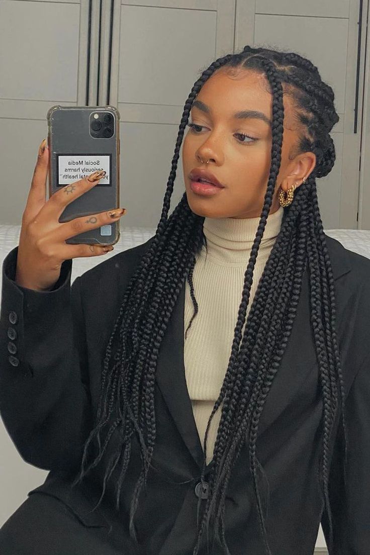 This hairstyle truly captures the spirit of the 90s. The clean middle part paired with long box braids feels powerful, confident, and beautifully structured. I love how this style makes everything look more polished, even the simplest outfit. It works perfectly for everyday wear and special moments because it feels bold but still comfortable. The braids frame the face in such a flattering way and give off that iconic 90s energy. This look is easy to maintain and stays neat for weeks, which makes it practical as well as stylish. It is one of those hairstyles that never stops feeling fresh and fashionable.