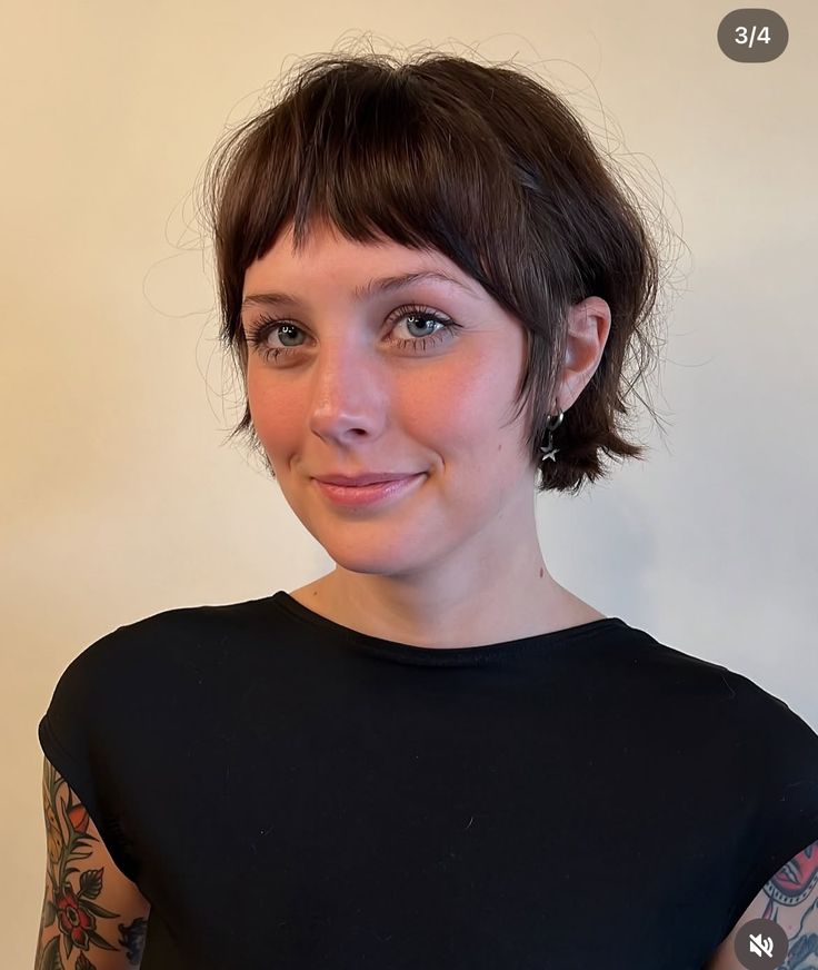 This hairstyle feels playful and expressive, which is why it stands out to me. The textured crop keeps the hair short and layered, while baby bangs add that unmistakable 90s flair. I love how the short fringe draws attention to the eyes and adds character. It’s not meant to be perfect, and that’s what makes it special. Honestly, it feels creative and fun without being over the top. This style is great if you love unique details and short hair that feels bold, artistic, and full of personality.