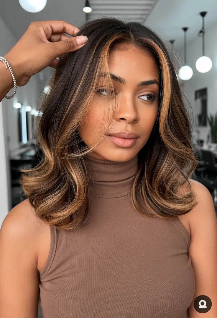 Golden brown face-framing balayage highlights brighten the complexion instantly, making them a perfect match for dark skin. By placing warm golden pieces around the front sections, this look naturally draws attention to your face and softens your features. The tones blend smoothly with darker bases, providing a natural glow without overpowering your look. This style is perfect if you want a subtle change that still makes a big difference. It works beautifully on curls, waves, and straight hair, giving your everyday look a warm, lifted feel. The grow-out is easy, and the highlights continue to look soft and flattering over time.