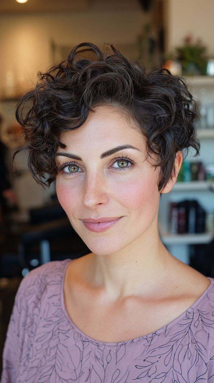This style feels light, elegant, and wonderfully freeing. I love how short length paired with soft curls adds lift at the crown while keeping everything easy to manage. The gentle texture frames the face beautifully and highlights cheekbones in such a flattering way. Styling usually takes only a few minutes with curl cream and finger shaping. This haircut feels perfect for women who want something fresh without spending too much time on daily routines. It keeps curls looking lively and youthful while staying polished and comfortable for everyday life.