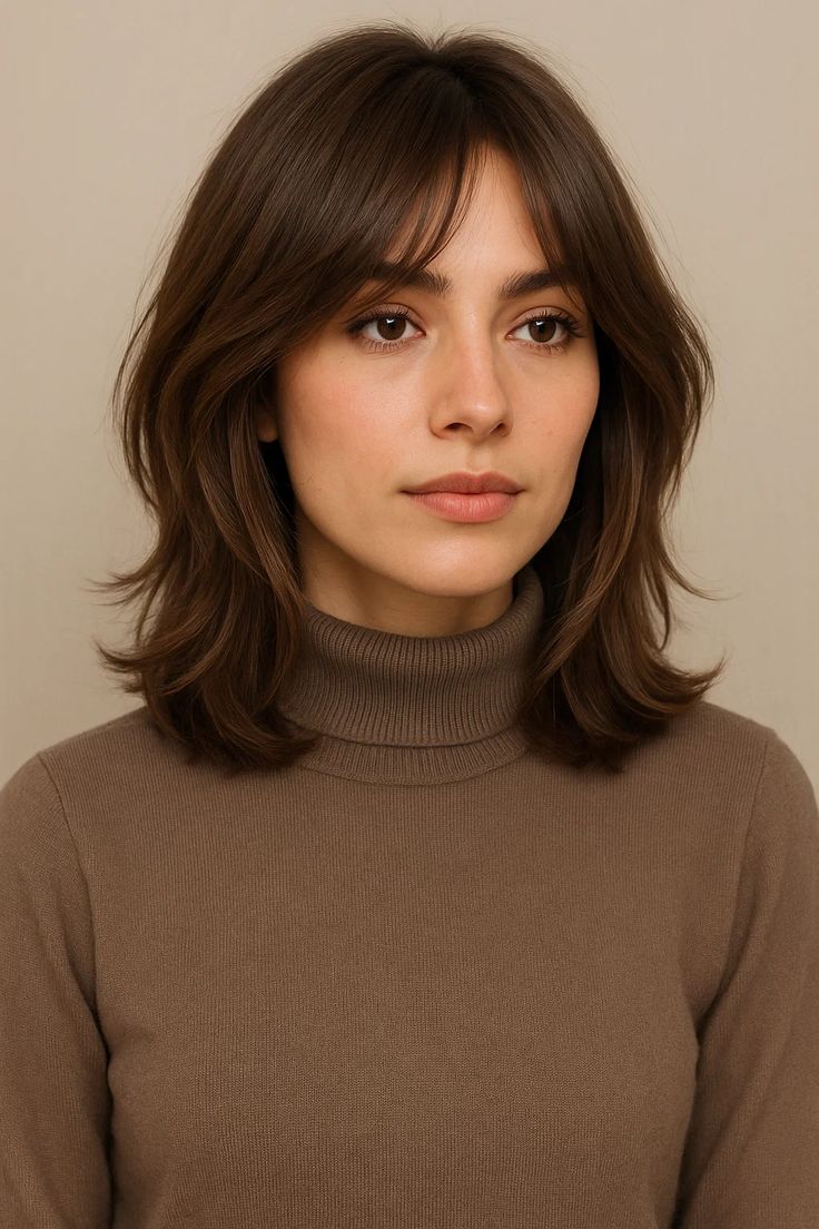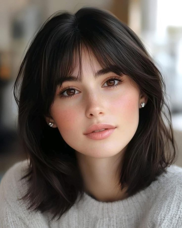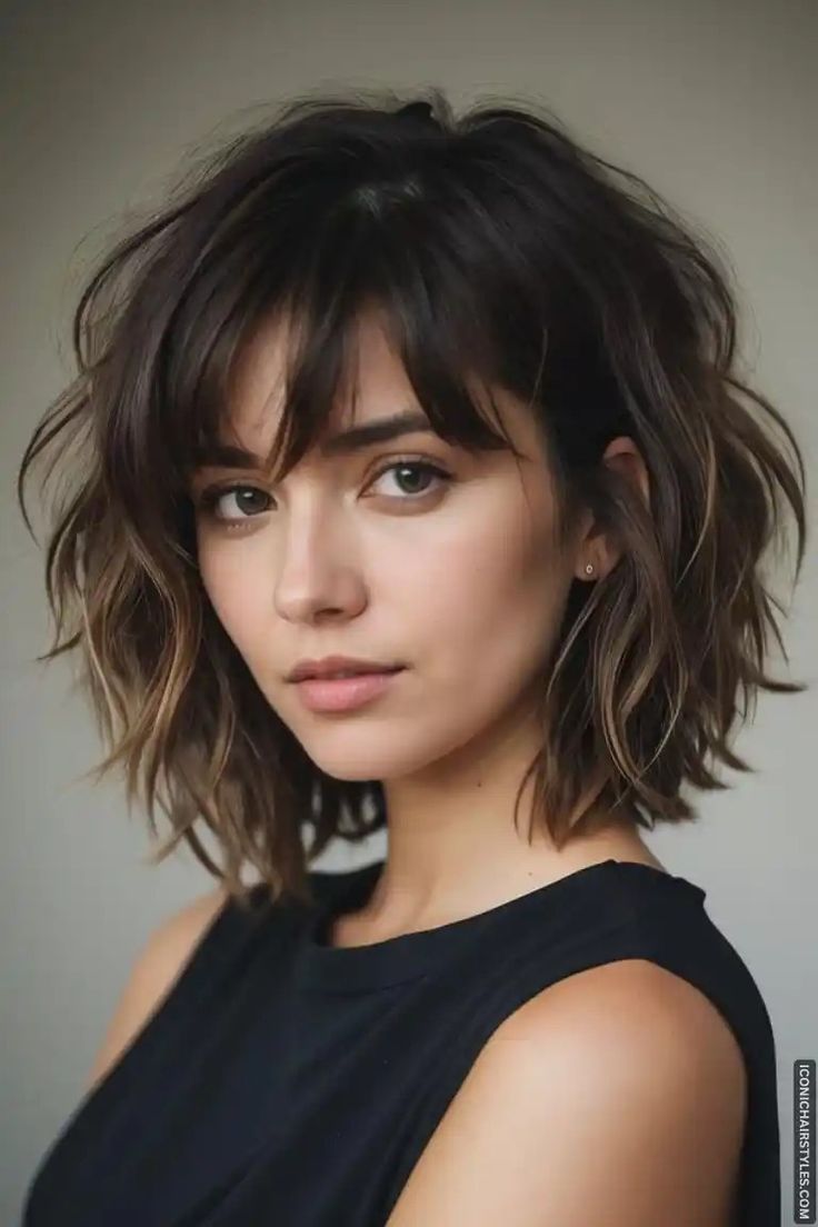 A layered bob with textured bangs is perfect if you want movement and personality in your haircut. I love how the layers give the hair a soft, dynamic shape while the textured bangs add a relaxed and modern edge. This style works wonderfully for wavy or slightly messy hair, but straight hair can be styled beautifully too. The choppy bangs blend seamlessly into the layers, giving the bob a cohesive and flattering look. This cut feels playful, light, and easy to maintain. It’s great for someone who loves a more laid-back, expressive style that still feels fresh and put together.
