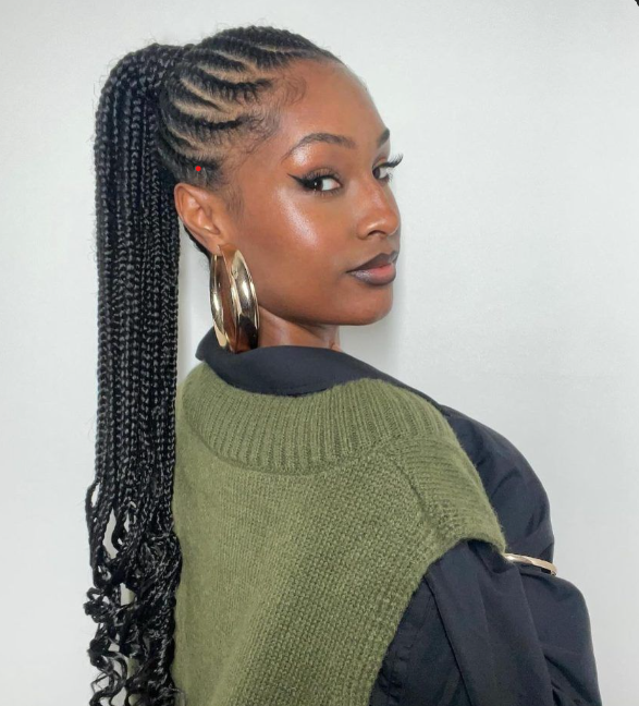 I usually play with the direction of the cornrows, straight back, curved, or even crisscrossed, depending on the mood of the shoot. I’ve found that sharp parting makes all the difference here. Once everything flows into the ponytail, the look feels intentional and bold. In my opinion, this style is perfect if you want something low-maintenance but striking.