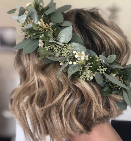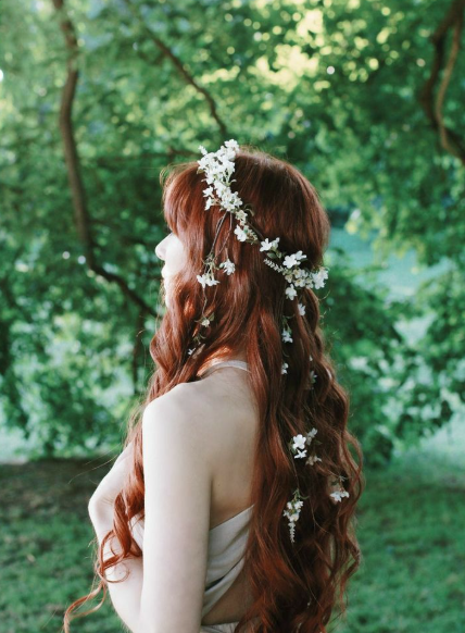 To create this look, braid your hair into a halo around your head, keeping it slightly loose for softness. Once the braid is secured, gently tuck small sprigs of baby’s breath into the braid with bobby pins. Don’t stuff them in randomly—space them out evenly but not perfectly. In my opinion, the charm lies in that slightly undone finish. And always test the flowers beforehand to make sure they won’t wilt too quickly.