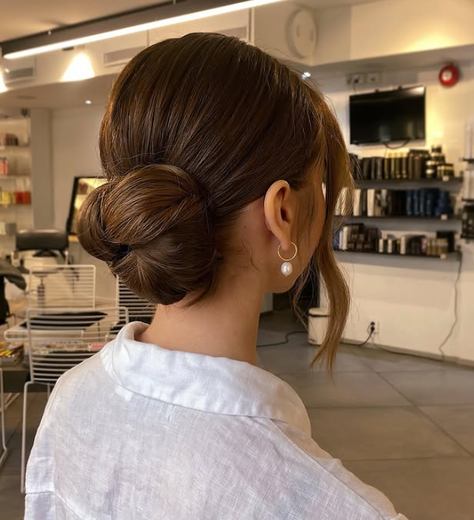 This is the bun that screams elegance—super polished, sleek, and always in style. I usually save this one for more editorial or formal looks. One time, I did this on a model wearing a minimalistic satin gown, and oh my god… it was giving total red carpet energy. The middle part really helps in balancing out a rounder face. It frames the forehead just right without exaggerating the width.