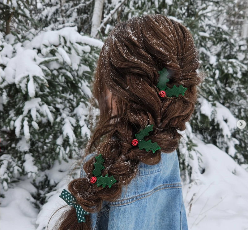 Red or green ribbons, velvet scrunchies, snowflake pins, mini ornaments, and tinsel strands all add a festive touch.