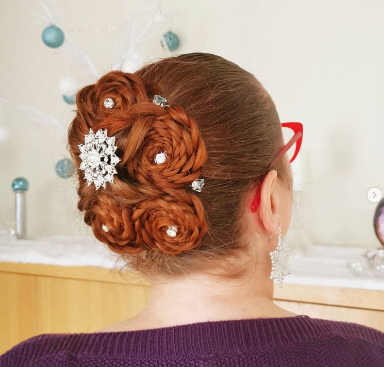 Now this one feels like stepping straight into a holiday fairytale. I love doing crown braids any time of year, but for Christmas, I weave in a bit of thin silver tinsel or glitter thread. I did this look on a ginger-haired model and it was pure magic—like a Christmas elf queen or something.
