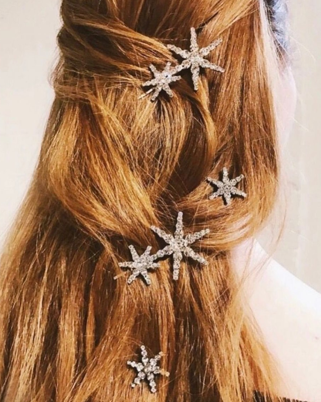 Okay, this one is pure Christmas magic. When I’m styling someone who wants to feel like a snow princess (yep, real request!), I go for a braided crown. It’s just two long braids wrapped around the head and pinned in place—but the key is the sparkly clips. I’m talking rhinestones, snowflakes, even little stars. I scatter them like they just fell there naturally.