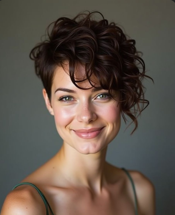 Ah, the asymmetrical curly pixie — the rule breaker. I’ve always had a soft spot for this one because it’s got that artsy, unpredictable flair. One side slightly longer than the other, curls falling however they please… it just works. I styled this once for a fashion shoot, and my model looked so effortlessly cool — like she’d just walked out of a Paris café. There’s something so modern and spontaneous about this cut.