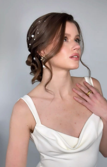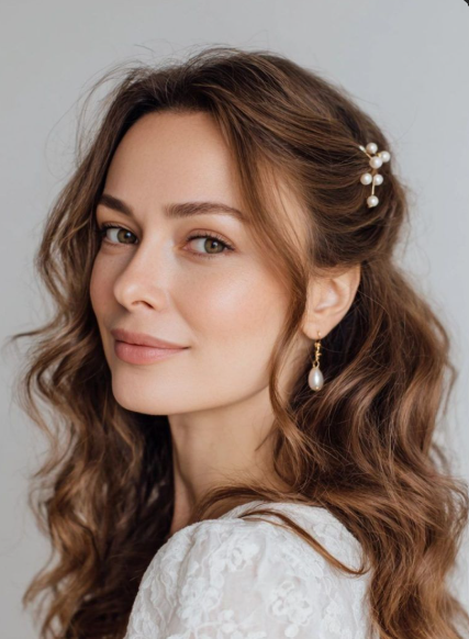 I curl my hair loosely, then pin back one side or a few front pieces. Pearl or gold pins look beautiful in photos. In my opinion, this style feels romantic without being overdone. It’s also great if you plan to take lots of pictures after—easy to refresh and still looks intentional hours later.