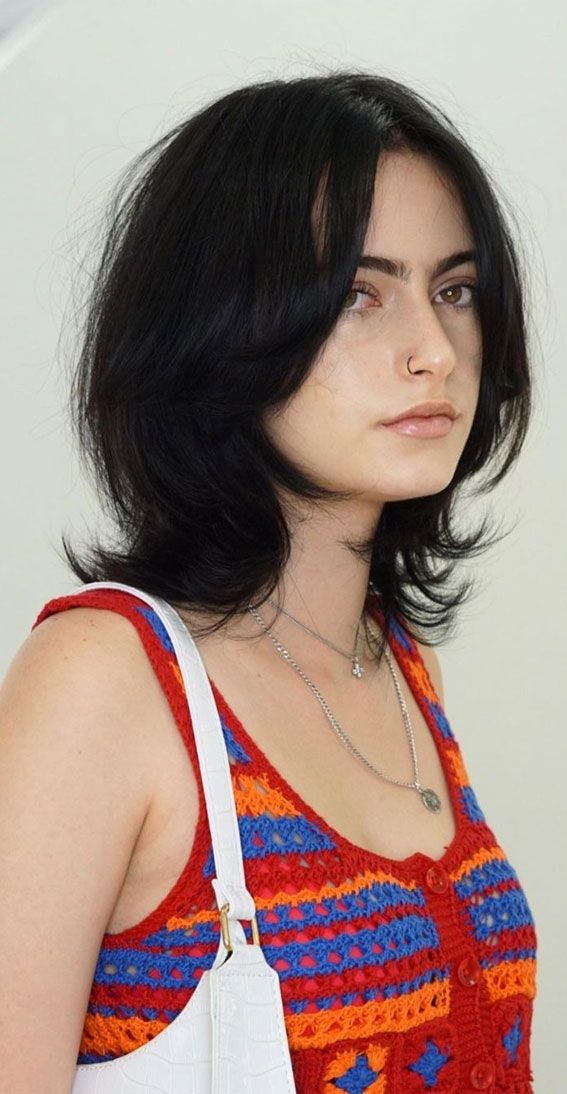 Micro bangs can work on round faces if the rest of the cut does the balancing. I pair them with a shoulder-skimming shag full of long, uneven layers that fall past cheeks. That contrast keeps the tiny fringe from widening the face. The bangs add punk attitude, while the length keeps things flattering. I style it messy, pushing bangs slightly to one side so nothing feels stiff. Texture spray is mandatory. It’s not a safe haircut, but that’s exactly why I love it—bold, rebellious, and dripping with old-school grunge spirit.