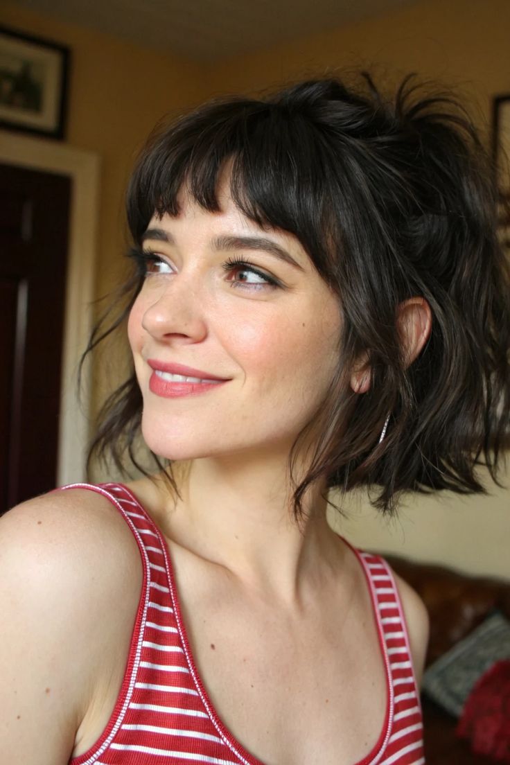 Wispy curtain bangs bring instant grunge energy because they soften the face while adding a moody, undone touch. Thick hair makes them blend beautifully into textured layers, creating a smooth flow from the bangs into the rest of the hairstyle. You can wear them parted down the middle, pushed aside, or tousled for extra attitude. They work with long, mid-length, or shag styles and always create a soft, expressive frame. Adding a bit of light styling cream or texture spray enhances movement without weighing them down. These bangs help your hair look intentionally messy while staying effortlessly stylish.