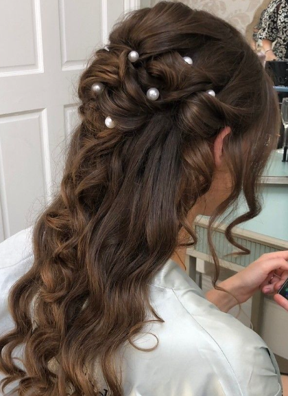 Pearls just scream bridal elegance to me. When I create a pearl-pinned half up hairstyle, I keep the base simple—usually soft waves or smooth curls—and then strategically place pearl pins along the secured section. It instantly elevates the look without adding bulk.