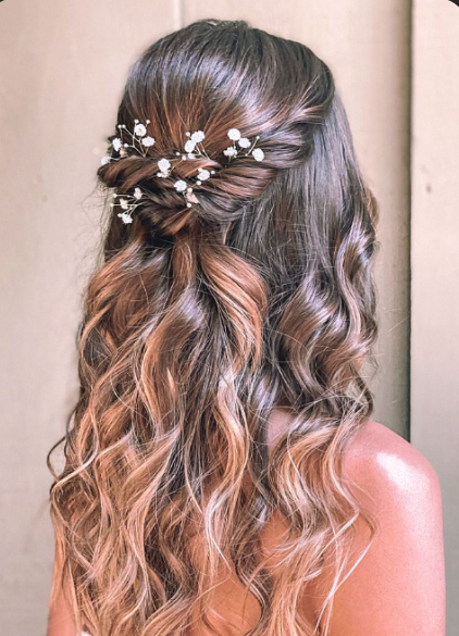 Floral accents always make me smile. Whether you use fresh blooms or delicate hair accessories, adding flowers to half up waves feels romantic and whimsical. I usually secure the half up section first and then place the flowers slightly off-center for a natural look.