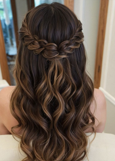 I absolutely love adding braids into half up styles. A braided crown instantly makes the look more detailed without feeling heavy. Usually, I create two small braids from each side and pin them across the back like a soft halo. It works beautifully for both traditional and modern bridal outfits.