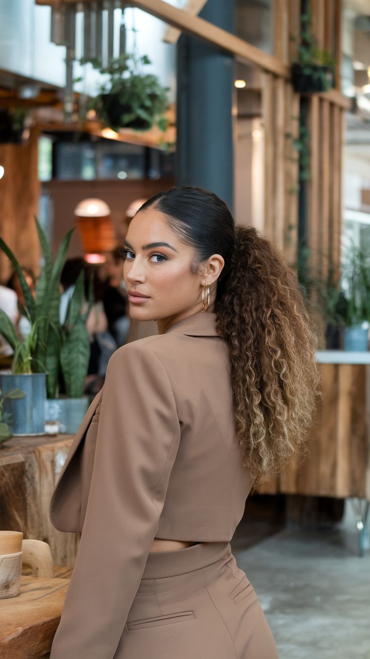 This look turns a regular ponytail into something extra fun. I love adding hair ties down the length and gently puffing out each section to create bubble shapes. The curls make each bubble even cuter. It feels playful and creative while keeping hair tidy. This style works well for medium to long curls and lasts all day. Kids love how bouncy and unique it looks.
