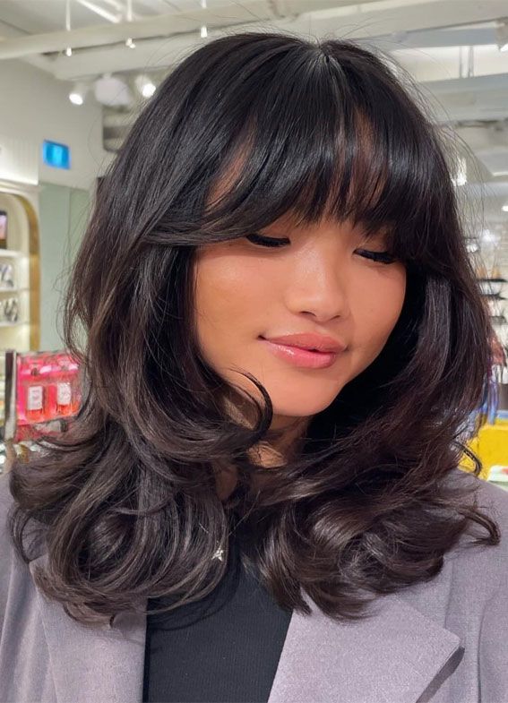 This hairstyle is all about balance and softness. The face framing bangs blend into gentle layers, creating a flattering outline around the face. I love how this style enhances natural features and feels so easy to wear. It works beautifully with straight or slightly wavy hair. The layers add movement without making the hair feel heavy. This look feels calm, elegant, and timeless.