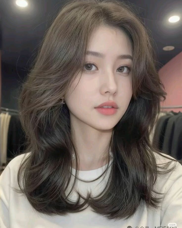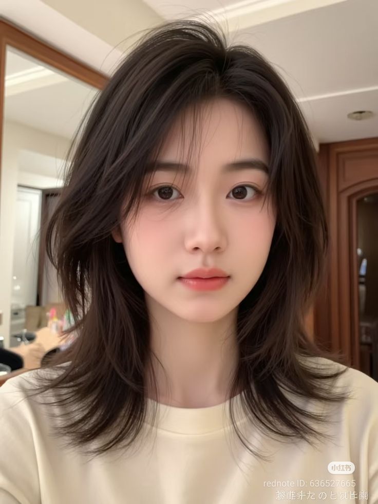 A layered Korean wolf cut with a light fringe creates an airy, face-framing look that feels youthful and natural. I love how the fringe sits softly across the forehead without being too thick or heavy. The layers cascade gently around the face, adding movement that never looks messy. This style works well on medium or long hair because the layers help distribute volume evenly. A simple blow-dry or finger styling is enough to bring the cut to life. It’s a great choice if you want something understated, feminine, and very wearable.