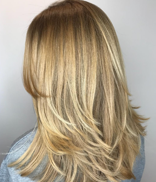Adding subtle highlights to long layers can add depth and dimension to hair. This draws the eyes away from the roundness of the face and creates a more sculpted look.