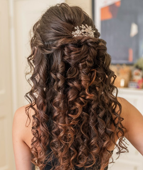 If you’re adding flowers, make sure the half up base is secure first. I usually create soft waves and pin the top section, then carefully tuck in fresh blooms or delicate floral pins. Placement matters — slightly off-center often looks more natural. I’ve found that less is more here. Too many flowers can overwhelm the hairstyle. Keep it balanced so your long hair still flows freely underneath.