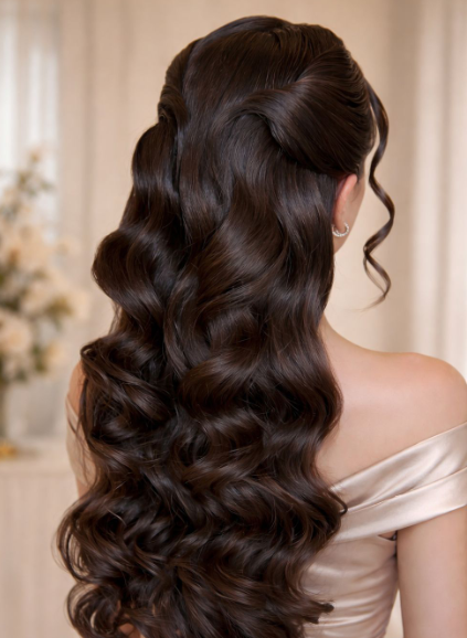 Now this one? Total drama — in the best way. Voluminous half up with Hollywood waves is for brides who love that old-school glamour. I’ve done this look for evening weddings, and under soft lighting, it looks absolutely stunning. The waves need to be structured but still soft enough to move.