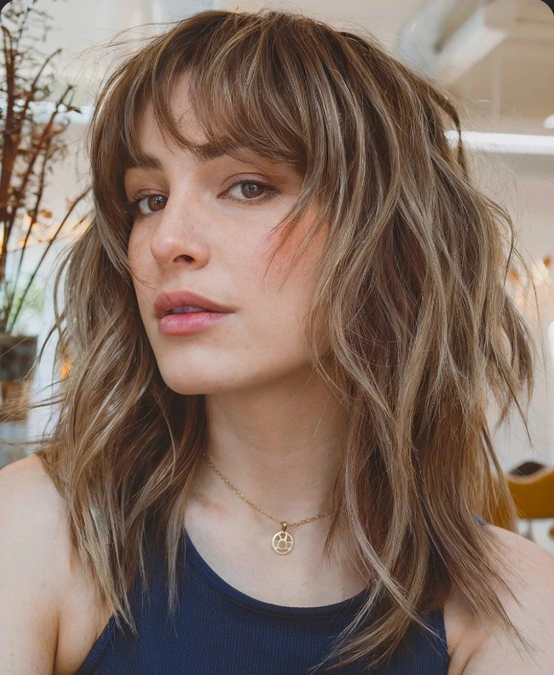 Yes, curtain bangs, wispy bangs, or choppy bangs blend perfectly with the layered style.
