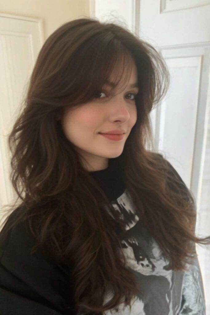 Textured fringe bangs paired with a long wolf cut create a messy, lived-in look that feels natural and stylish. The bangs are slightly longer and uneven, blending into the top layers for a seamless finish. This version works beautifully on wavy and curly hair, where the fringe naturally separates and adds character. The long layers in the cut keep the hair flowing while still maintaining that classic wolf-cut shape. It’s perfect if you love hairstyles with movement, texture, and a little bit of chaos. It’s cool, expressive, and easy to style.