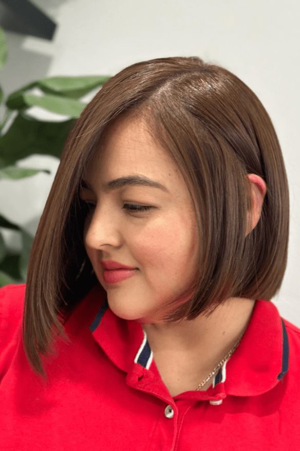 This one brings quiet drama in most tasteful way. I sweep hair into deep side part and let long fringe fall diagonally across face. The angle creates flattering shape while rest of bob stays neat and polished. I focus volume near crown but keep sides smooth. What sells the look is shine—glossy hair always reads expensive. I love wearing this style with crisp coats and gold studs for full effect. It feels sophisticated, confident, and timeless without crossing into overly styled territory.