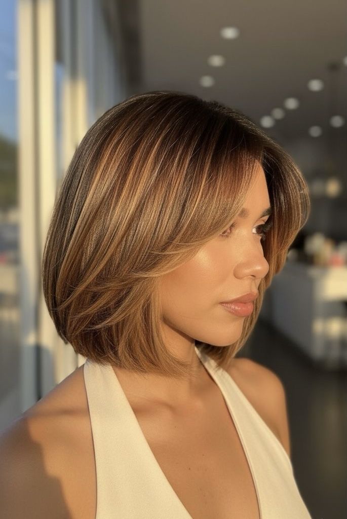 This style always makes me feel instantly put together. I keep bob blunt and smooth, then style ends tucked inward using round brush. Side fringe sweeps across forehead and blends into cut for flattering shape. It’s perfect for highlighting cheekbones without adding drama. I avoid volume overload—just gentle lift at roots and lots of shine. What I adore is how sophisticated it looks with minimal styling effort once cut is right. Pair with neutral coats and gold jewelry and whole look feels elevated. It’s classic, dependable, and endlessly chic in quiet, confident way.
