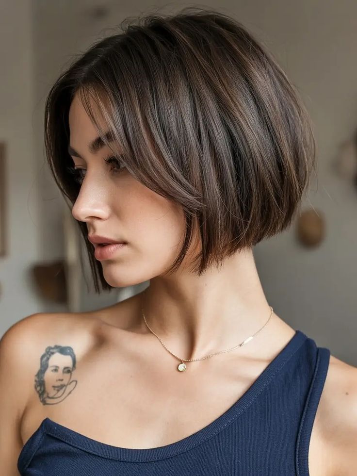 For something slightly bold yet still refined, I choose jaw-length bob with very light, micro-soft bangs. The fringe stays airy and short enough to show brows while blending into sides. I keep perimeter sharp and smooth for tailored silhouette. Styling focuses on shine and clean edges. What makes this haircut special is contrast—structured bob paired with delicate fringe. It feels chic and quietly striking without crossing into trendy territory. Perfect for someone who wants personality while maintaining timeless elegance.