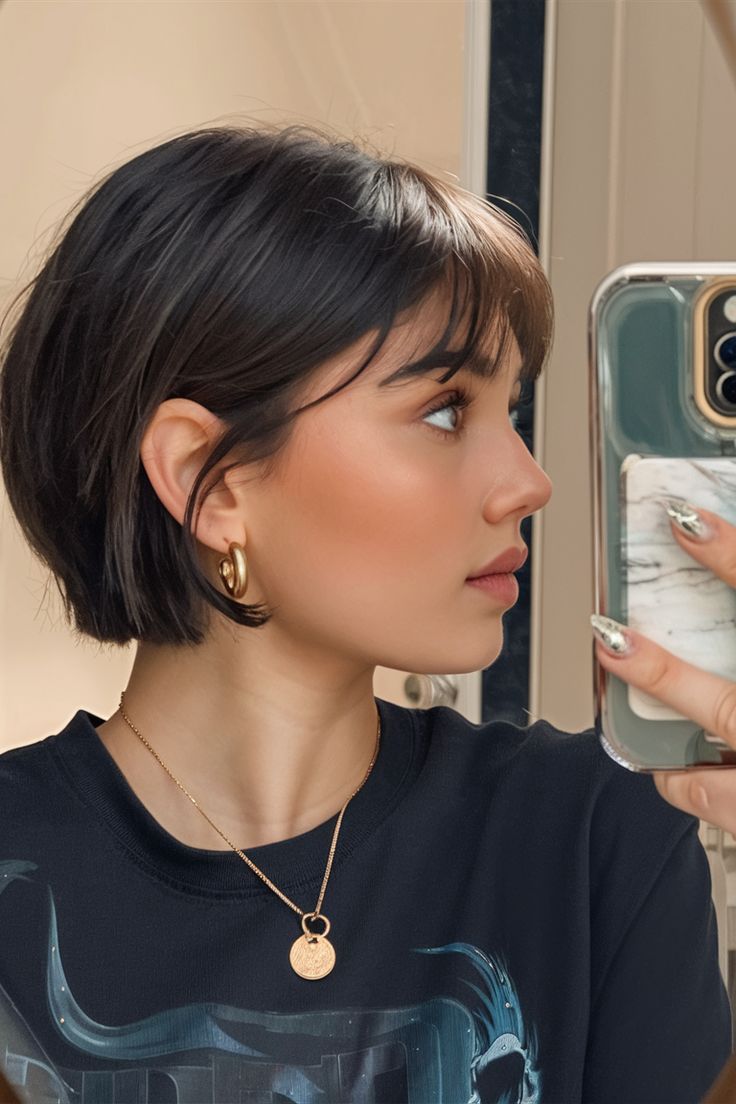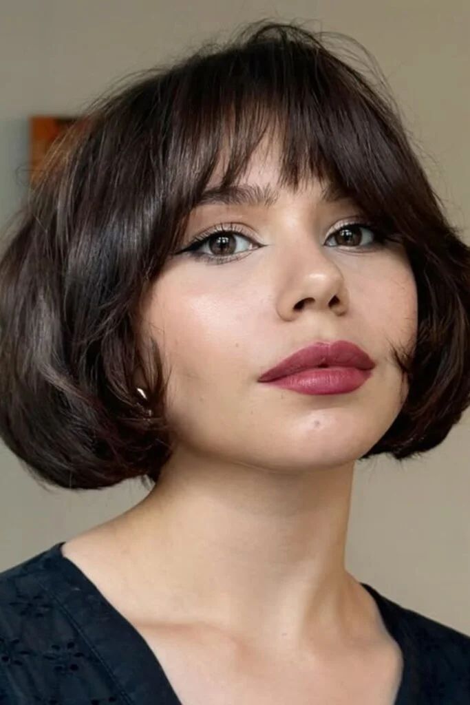 This version feels romantic yet understated. The bob curves inward gently and the soft fringe floats lightly across forehead. I keep everything airy and smooth rather than stiff. Styling takes minimal effort once cut is right. What makes it truly special is how natural it looks, like hair simply falls into perfect shape. It pairs beautifully with neutral wardrobes and minimal makeup. The overall vibe feels quietly luxurious, timeless, and effortlessly chic in the most graceful way.