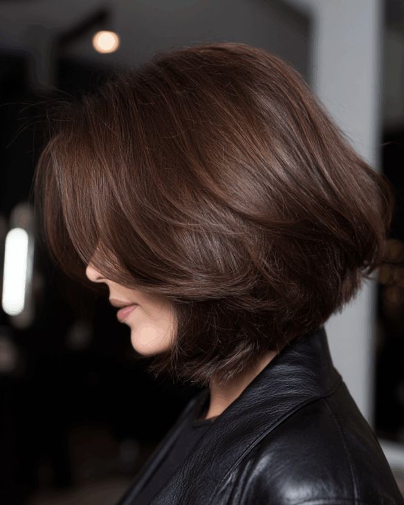 When I want a little more flow, I add very subtle, blended layers to my brunette bob. They’re barely visible but allow the hair to move naturally when I walk. I keep styling smooth with a light inward bend at the ends. The rich brown color enhances that movement and adds depth. What makes this cut special is how effortless it looks while still appearing polished and refined.