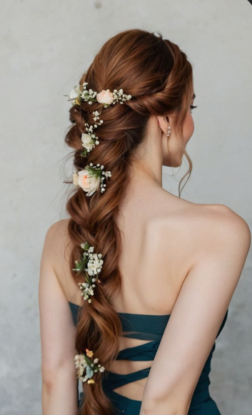 This one takes me back every time. There’s something so culturally rich about a long bridal braid decorated with flowers, and I still get brides asking for it specifically. I’ve found it works best for brides who want length to be the highlight rather than volume. The braid doesn’t need to be super tight; honestly, a slightly relaxed braid feels more modern and romantic.