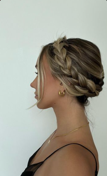 This one always feels a little magical to me. A braided crown paired with curls gives off such soft, romantic energy, and every model I’ve done this on ends up smiling nonstop. Honestly, it’s hard not to feel special with this style. I’ve found it works beautifully for outdoor or fairy-tale-themed proms.