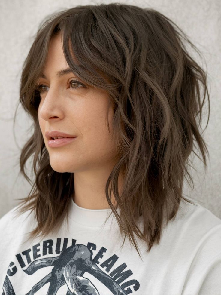 A shag haircut with side swept bangs is perfect for thin hair because it creates soft movement and visual fullness. The bangs add depth at the front while the layered body gives volume throughout. This style feels effortless and flattering for many face shapes. It works well whether the hair is worn smooth or lightly tousled. The side swept bangs blend naturally into the layers, keeping the look cohesive and balanced. Thin hair benefits from this shape because it adds texture without losing length. It’s a comfortable and stylish haircut that feels fresh and modern while remaining easy to maintain.