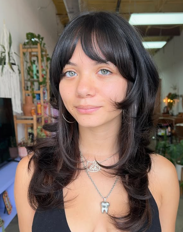Natural waves shine in this style that blends layered volume with shaggy fringe. The bangs help frame the face, making it flattering for oval and heart-shaped faces.