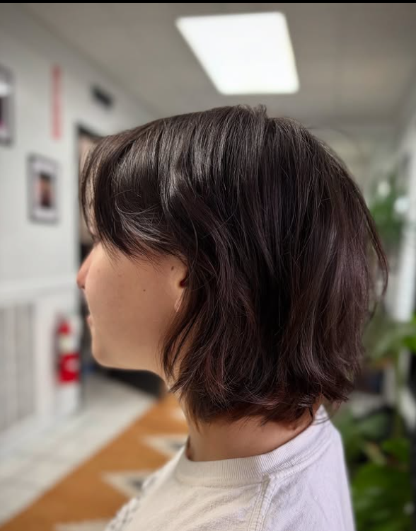 This timeless cut features soft, choppy layers and curtain bangs that frame the face beautifully. It gives a relaxed, effortless look and adds natural volume to fine or medium hair.