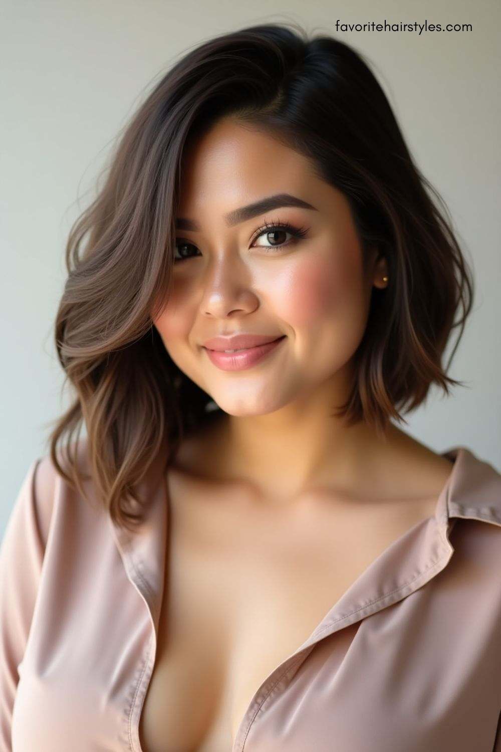 An asymmetrical bob with one side slightly longer adds edge and balance. The uneven cut creates the illusion of a slimmer jawline and flatters rounder cheeks.