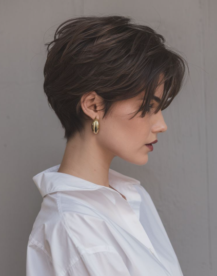 When I style this cut, I blow-dry the bangs forward first, then sweep them to the side. A light mist of flexible hairspray keeps them in place without stiffness. In my opinion, this style is perfect if you want something feminine but still short and practical. It feels styled without looking like you tried too hard.