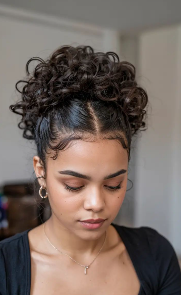 The half-up curly bun feels like a compromise I actually enjoy. I pull the top half of my curls back and secure them into a small bun, leaving the rest loose. It gives me height without hiding all my curls.