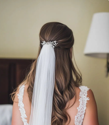 For this look, I focus heavily on prep. Blow-dry with a smoothing brush, then use a flat iron section by section. A lightweight serum adds shine without making it greasy. The veil placement matters a lot here. I usually secure it slightly above the crown so it flows smoothly down the straight hair. Keep it polished, but not stiff. Movement is still important.