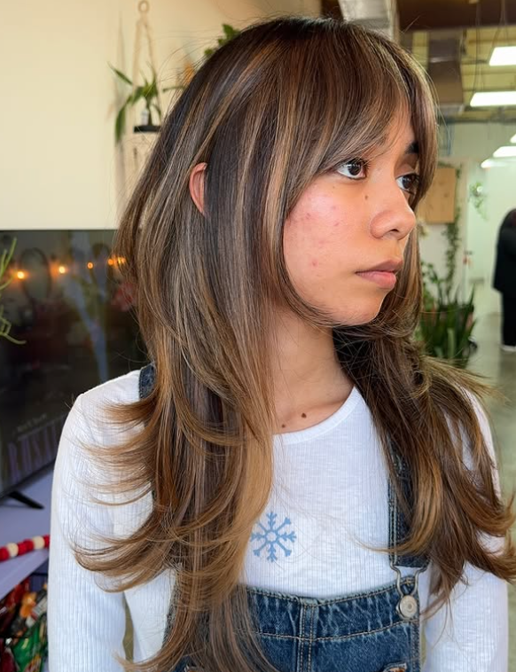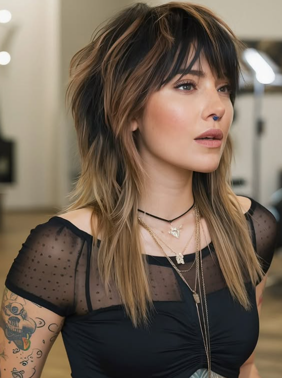 Caramel highlights add a sweet glow to brunette wolf cuts, creating a soft contrast that brings out movement and shape. It’s a great everyday look with a trendy edge.